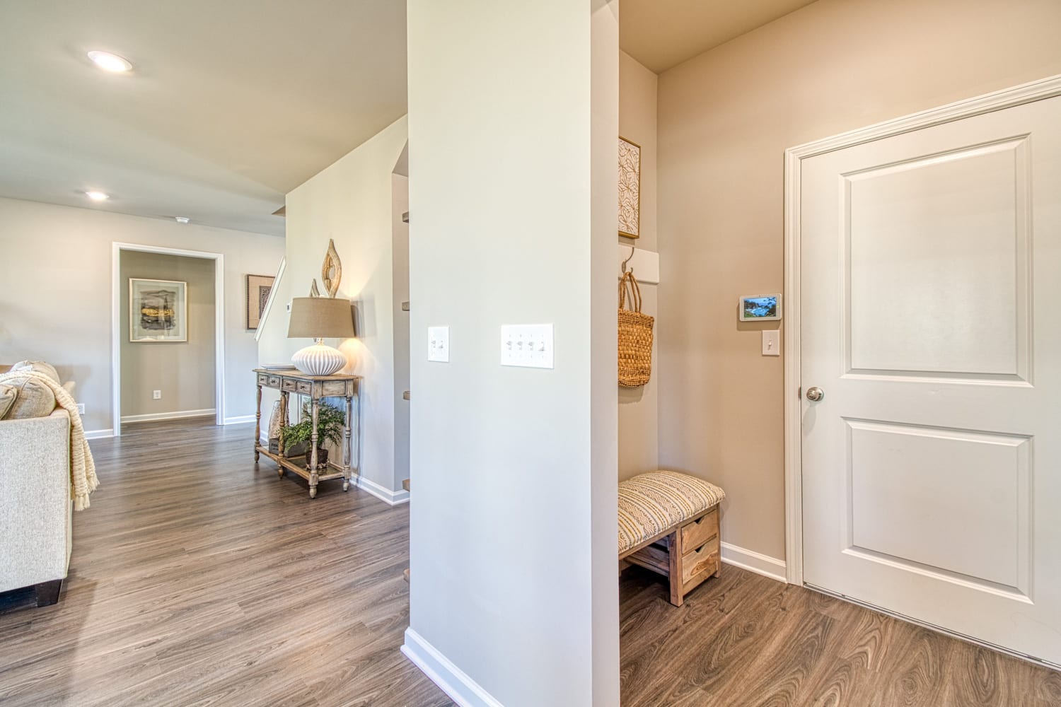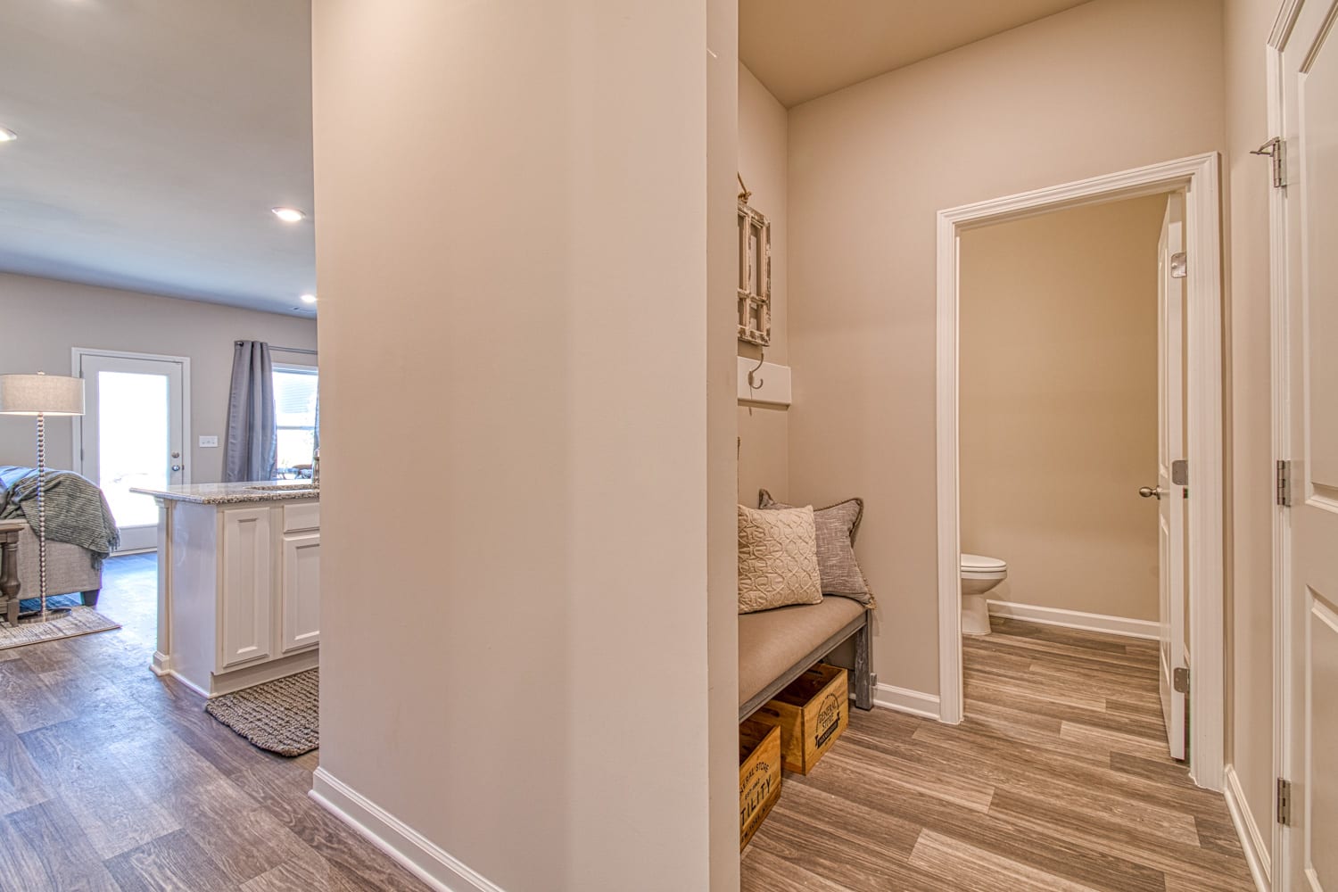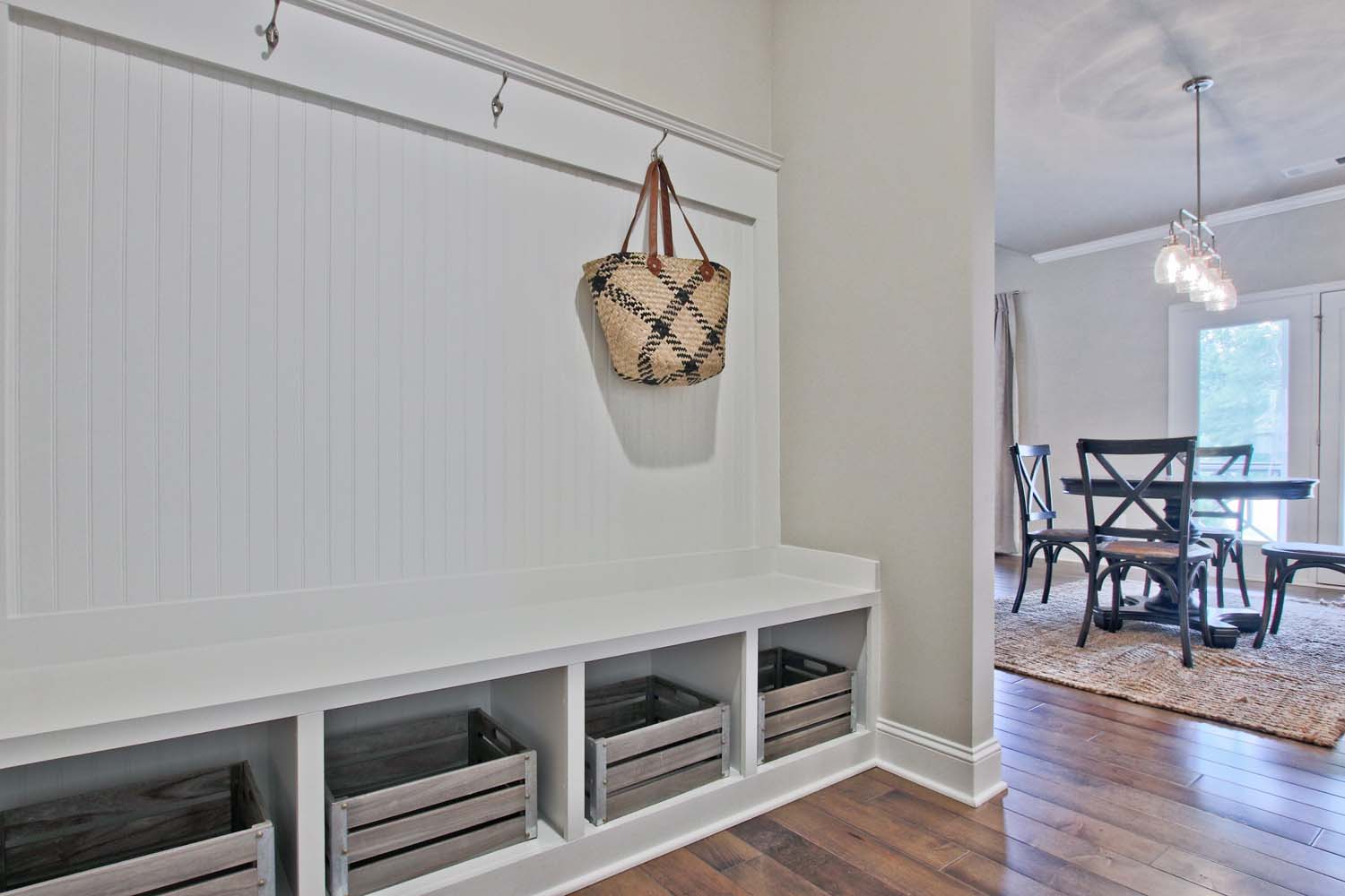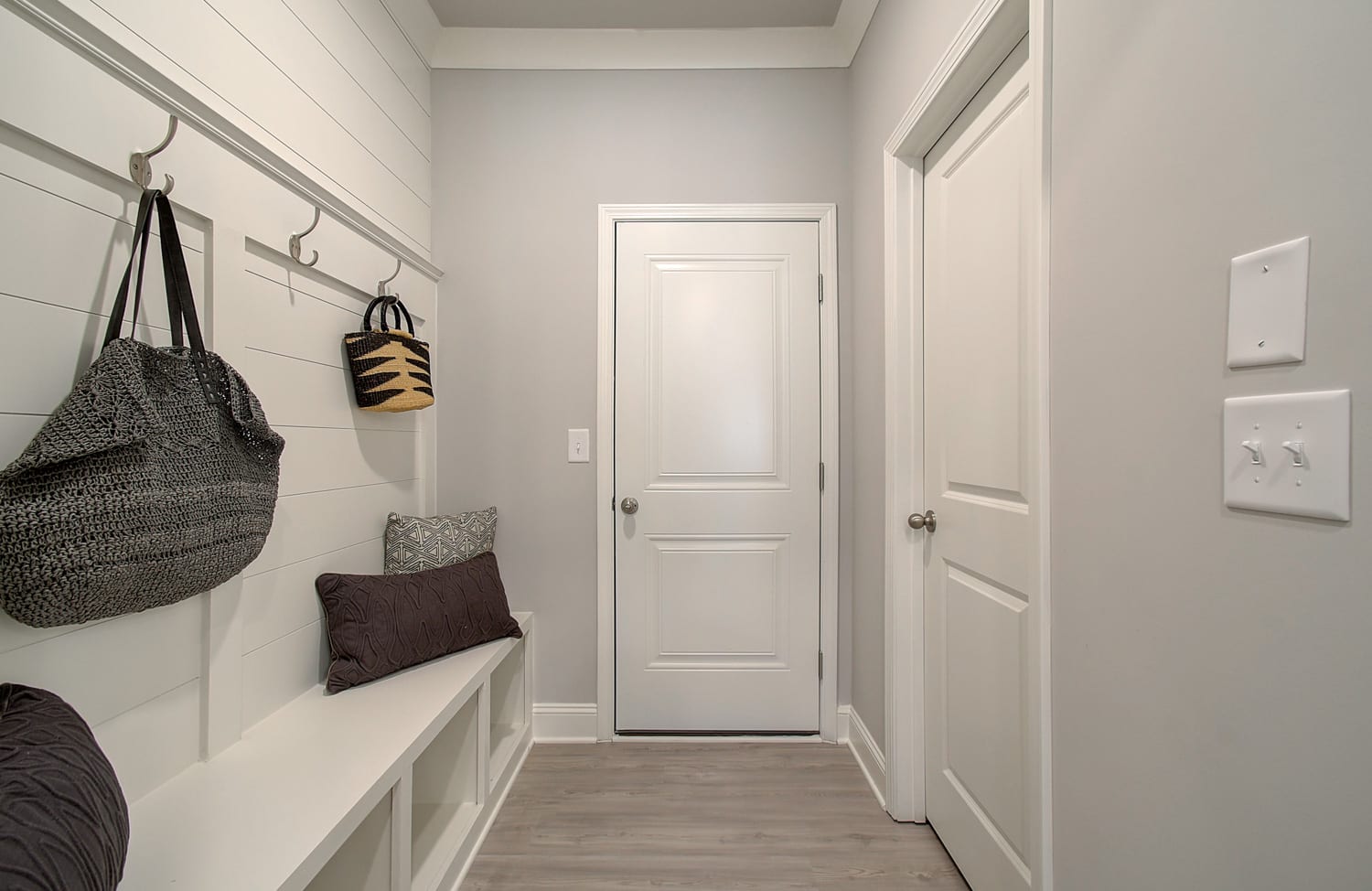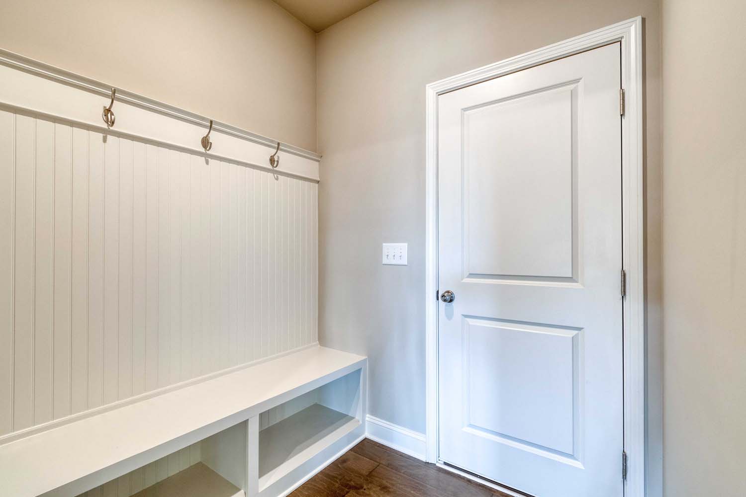 Most of our floor plans have these spaces designed into the architecture. There are many options that buyers can do to make the space their own like adding headboard and hooks (valet), built in cubbies, tiling the floor or putting LVP flooring in. Some mudroom designs include a bench or cubbies for shoes, cabinets, and coats. No matter what design plan you choose for your space it will surely keep the clutter at bay and your home organized.